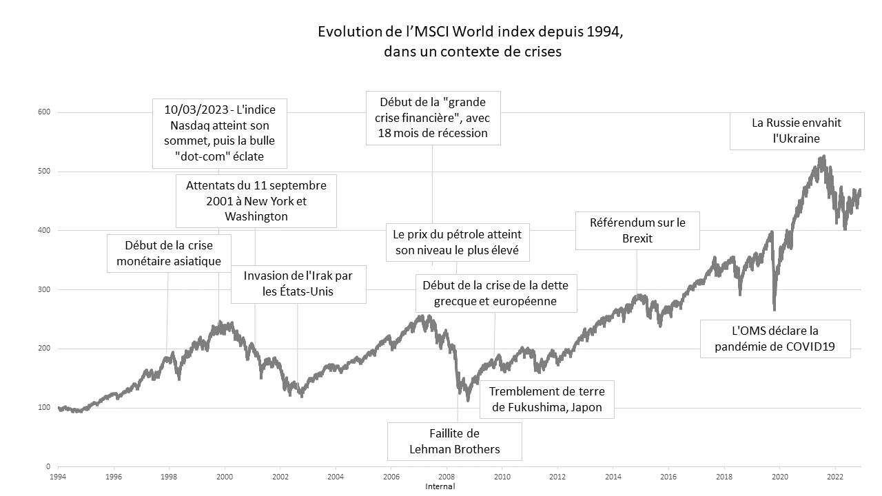 Alors que les chiffres brossent un autre tableau que notre ressenti. S'il est vrai que la pandémie, l'inflation et la guerre entraînent d'importantes fluctuations du marché à court terme, leur impact sur les cours reste limité à long terme. Seulement quelques mois après la crise du Covid, les cours boursiers se rétablissaient déjà après un premier gros recul. Bien sûr, un redressement boursier aussi important immédiatement après une crise profonde n'est pas toujours la norme, et tous les marchés ne se sont pas redressés dans la même mesure. Mais il illustre une erreur fréquente que nous sous-estimons souvent : l'incroyable résilience de l'économie. Et en tant qu'investisseur, vous profitez justement de cette résilience, puisque vous participez à la création de valeur de l'économie.