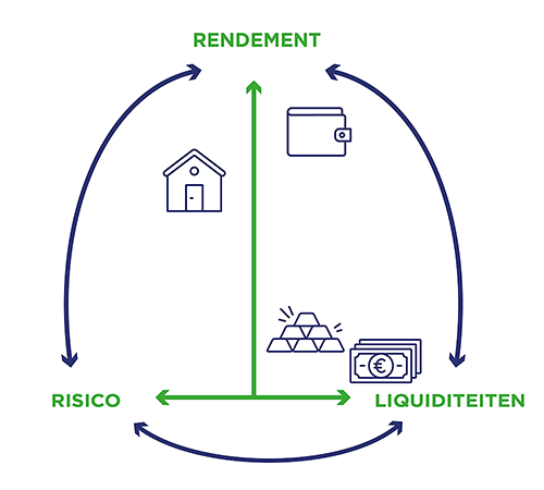 In de beleggingsdriehoek zijn deze drie elementen met elkaar verbonden. In het algemeen stellen we vast dat beleggingen met een potentieel hoog rendement vaak gepaard gaan met een hoger risiconiveau en een lagere liquiditeit. Omgekeerd bieden veiligere en meer liquide beleggingen vaak een potentieel lager rendement.