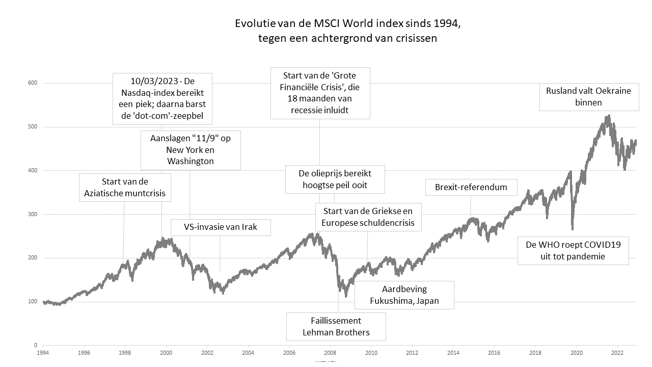 Terwijl de cijfers een ander beeld schetsen dan het buikgevoel. Ja, de pandemie, inflatie en oorlog leiden tot grote marktschommelingen op de korte termijn, maar op de lange termijn blijft de impact op de koersen beperkt. Slechts een paar maanden na de covidcrisis waren de beurskoersen alweer aan het herstellen na een eerste grote terugval. Toegegeven, zo’n sterke heropleving van de beurs meteen na een diepe crisis is niet altijd de regel, en niet alle markten hebben zich in dezelfde mate hersteld. Maar ze is wel een illustratie van een een veelgemaakte fout: we onderschatten vaak de enorme veerkracht van de economie. En als belegger profiteert u net van die veerkracht, omdat u deelneemt in de waardecreatie van de economie.