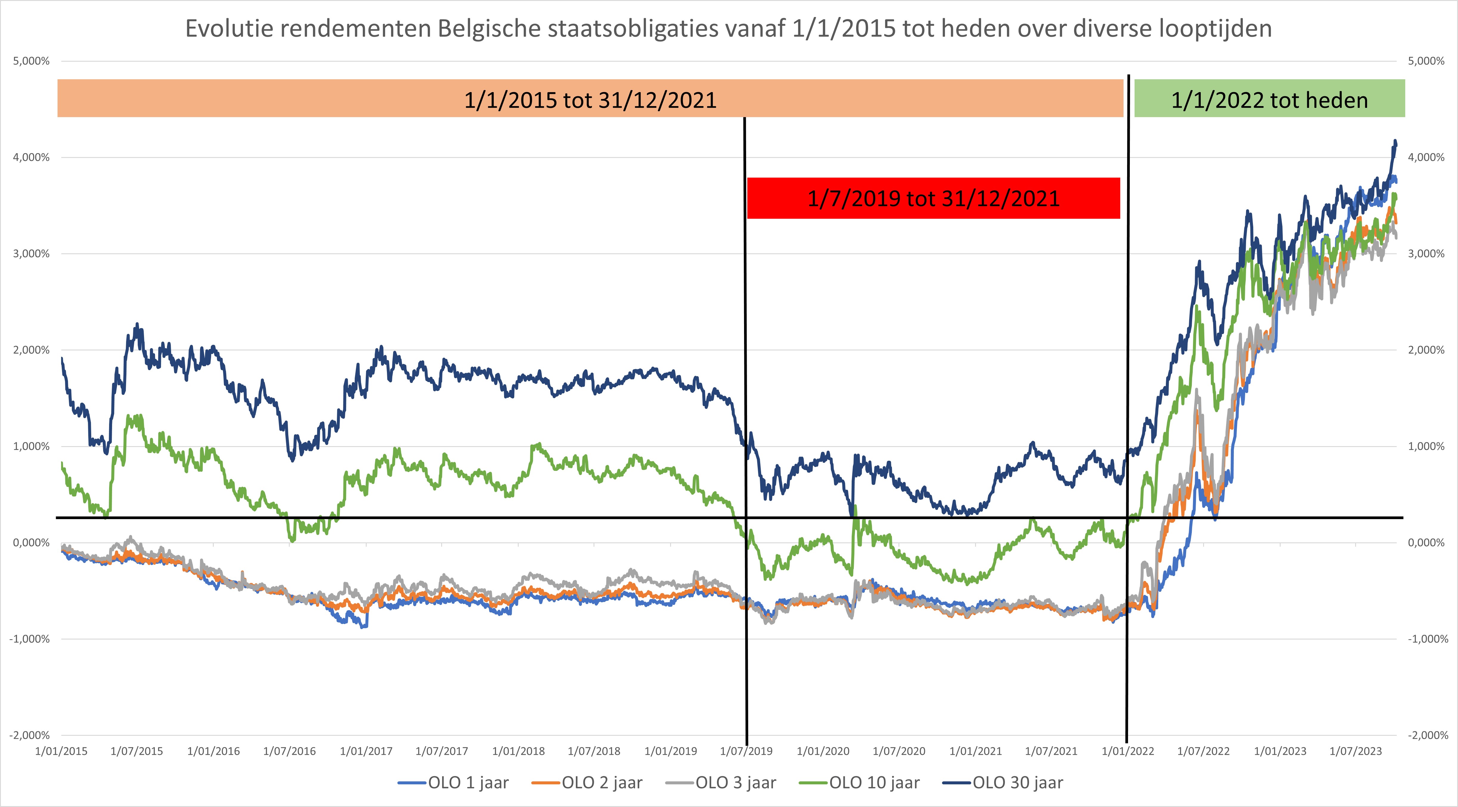 Zoals de grafiek hieronder toont gaven de Belgische staatsleningen met een duurtijd tot 3 jaar tussen 1 januari 2015 en 31 december 2021 bijna allemaal de hele tijd een negatief rendement. Zelfs het rendement van de OLO (lineaire obligatie) op 10 jaar noteerde gedurende de periode tussen 1 juli 2019 en 31 december 2021 meestal negatief.