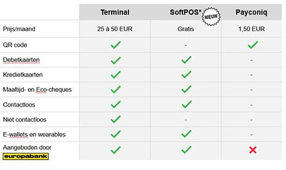 Welke soorten terminals bestaan er? En wat is het verschil? We vergelijken hieronder de klassieke mobiele terminal met de SoftPOS by Europabank-app & de Payconiq-app: