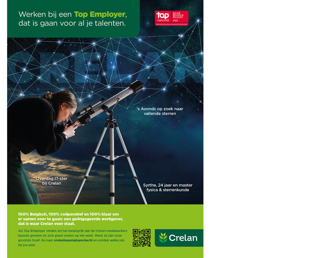 Saskia De Smet, verantwoordelijke Talent Management & Talent Acquisition: “Crelan wil zich onderscheiden als klantvriendelijke bank en dat begint bij het welzijn van onze collega’s. Tevreden werknemers die zich goed voelen, stralen dat ook uit. Door hen hun talenten te laten ontwikkelen, hun creatieve ideeën te laten inbrengen en hun enthousiasme te koesteren willen we elke dag opnieuw bijleren en het telkens beter doen. Dat we nu opnieuw als Top Employer erkend zijn danken we aan ons goede personeelsbeleid, maar nog meer aan onze 725 sterren die elke dag het beste van zichzelf geven voor onze klanten en bankagenten.”